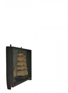A diorama of a French carved and painted wood model of a ship, late 18th Century the ship with four sails, in a wood frame. W77 x D10 x H56.5