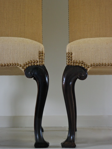 A bespoke Queen Anne style upholstered, ebonised dining chair the legs with scroll top and square foot, upholstered in jute, with stud detail; five chairs available. W58 x H104 x D66.5  70kgs
