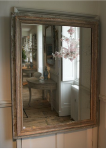 A French Louis XVI style carved and painted gilt wood mirror made from a melange of antique materials, grey paint W104 x H136 AB00885