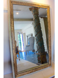 A French Louis XVI style carved and painted gilt wood mirror made from a melange of antique materials, original mercury plates, grey paint. One of a pair. W116 x H174