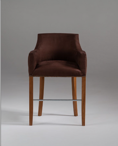 A French Oak bar stool with rounded back, tapering legs and polished metal foot rest, available in a range of fabrics, with or without studded detail, plus 2m fabric, from £875 plus VAT. W61 x D51 x H98 AB01164
