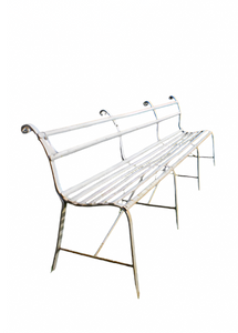 An English painted wrought iron garden bench, early 20th Century with open back and slatted seat, off white paint. L305.5 x D66 x H92.