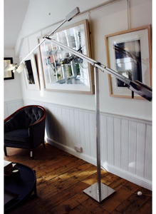 An Italian chrome plated steel and aluminium 'Giraffe' lamp by Angelo Brotto, circa 1970 with pivotal arm, electrified. L281 x H153 x W10 15kgs
