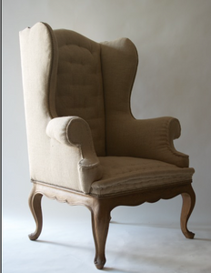 French style wing chair with stained polished legs and upholstered in jute with domed nails.