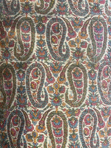 1880 Rectangular Kashmir woven wool shawl, cream field with horizontal bands of flower filled both; later cream pashmina ends.