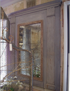 A French Louis XVI style carved and painted gilt wood mirror with a column to either side, with original mercury plate, grey paint W144 x H166.