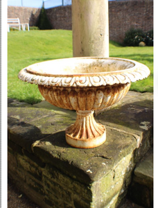 A pair of painted cast iron shallow urns, 19th Century of shallow form with everted rim with acanthus motif, the body and splayed foot fluted, white paint AB01349