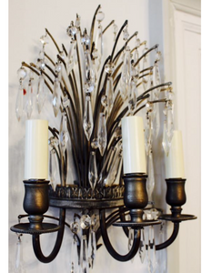 A pair of French cut glass and gilt metal wall sconces, circa 1940 the back in form of a fan, with three sconces to each. W25 x D17 x H44.