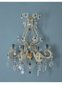 A pair of mid 20th Century French gilt metal and cut glass four light wall sconces with flower heads and droplets, clear and coloured glass, the lights with candle fittings. W58 x H75
