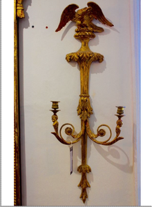 A pair of George III carved gilt wood twin-branch wall lights, late 18th century each surmounted by a spread eagle on a foliate, reeded tapering shaft, with scrolled branches and herm heads supporting the brass nozzles. W35 x H90