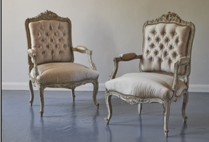 A pair of French Louis XV style carved and painted wood armchairs, circa 186 with carved floral decoration, upholstered in buttoned silk. W72 x D59 x H106
