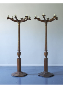 A pair of Arts and Crafts oak candelabra floor lamps, early 20th Century each with six arms and sconces, the reeded shaft with fluted baluster section, octagonal bases, electrified W80 x H193