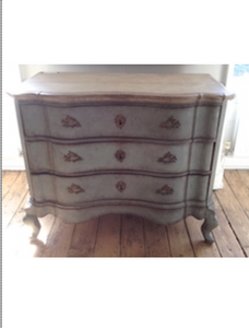A Swedish painted wood serpentine commode, mid 18th Century painted pale blue, gilt foliate handles. L118 x W62 x H95